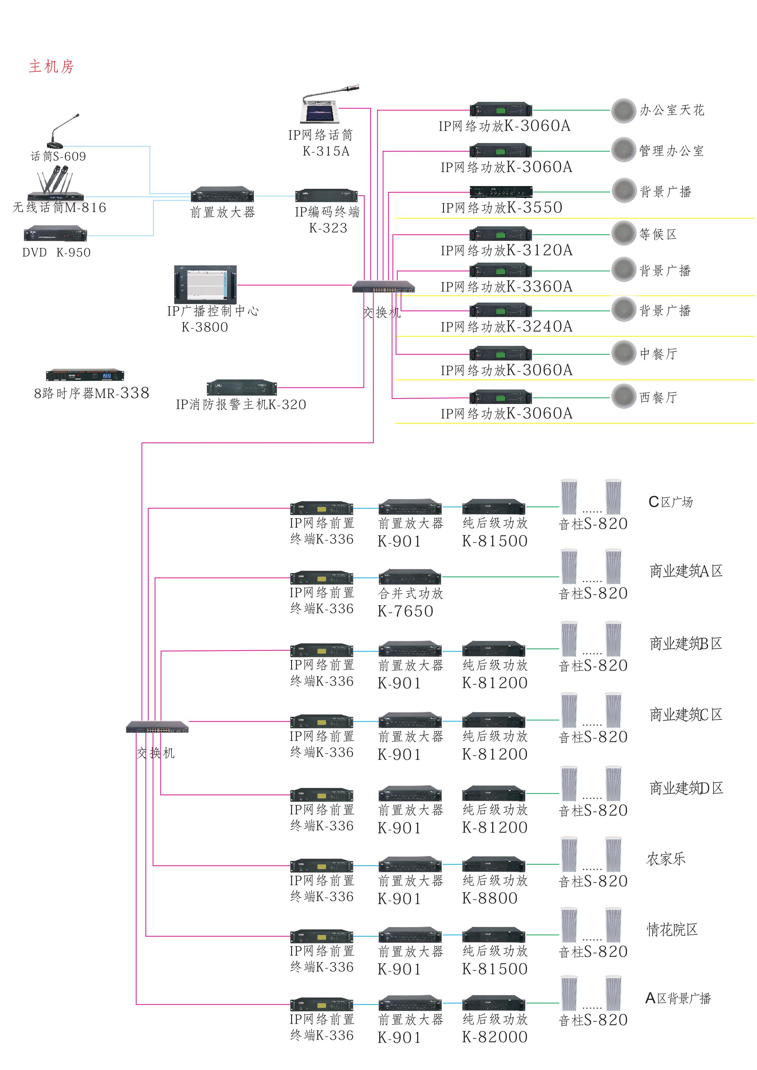 1.大型商业综合体广播系统共用计算机网络或布设广播专用网络,音源输入使用8分区的IP网络输入单元,可提供多达8路高质量音乐广播音源,用于酒店、大型商场、写字楼、停车场的信息发布及背景音乐播放,也可为写字楼提供上下班定时打铃功能;