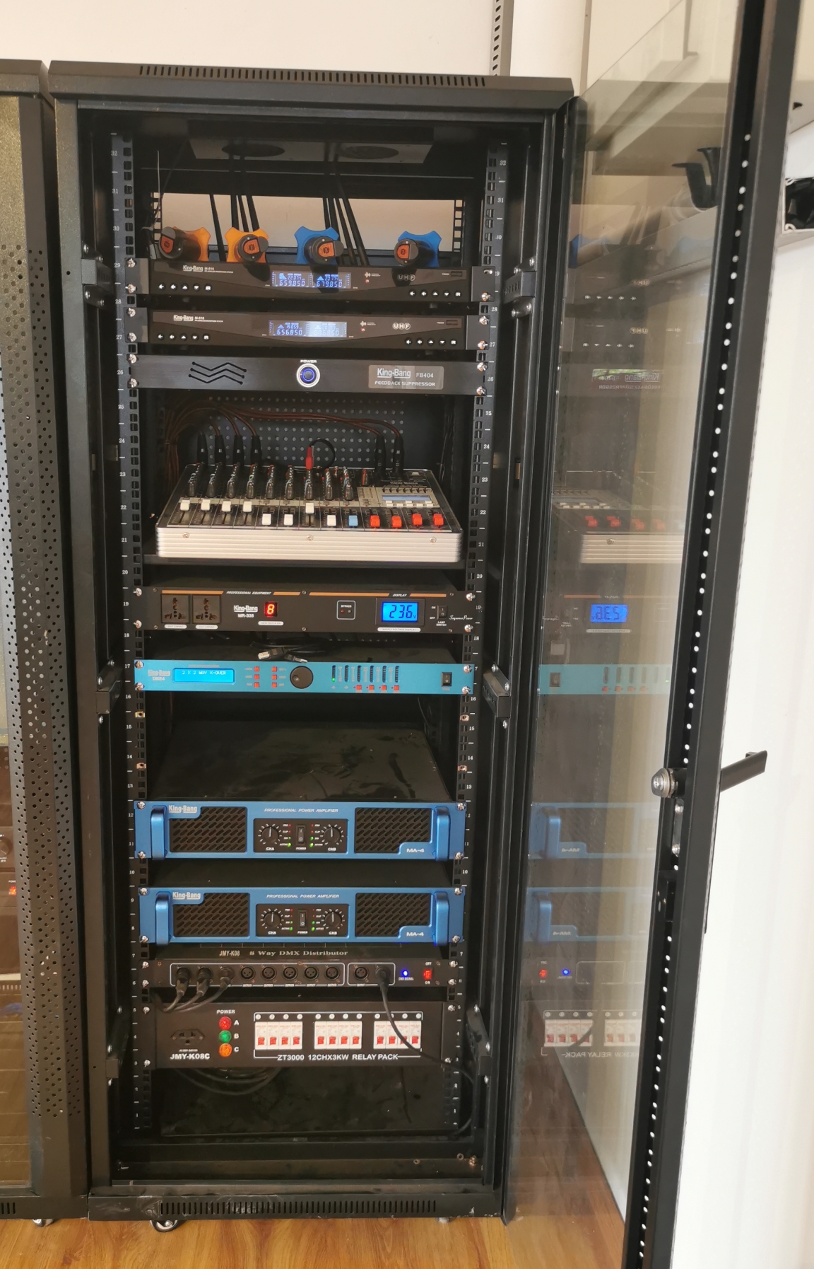 京邦电子(KING-BANG)京邦技术工程师通过对多媒体教室的布局环境分析,对音响设备进行合理的布置与连接,并安装的音响设备,可以使声源和音响系统末端——音箱同处于一个声场区域内,使观众能感受到声源的真实存在,达到高保真重放的扩声要求。且达到多媒体教室音响以自然声为主,要求扩散性良好,声场分布均匀,响度合适,自然度好等要求。