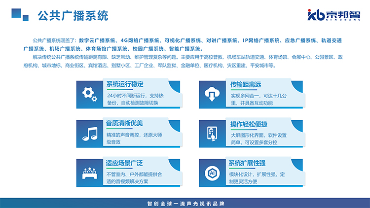 系统具有实时广播、定时广播、分区广播、电话广播、自由点播、实时采播、消防联动、电源控制、现场监听、双向对讲、触发联动等功能、操作简单便捷等。