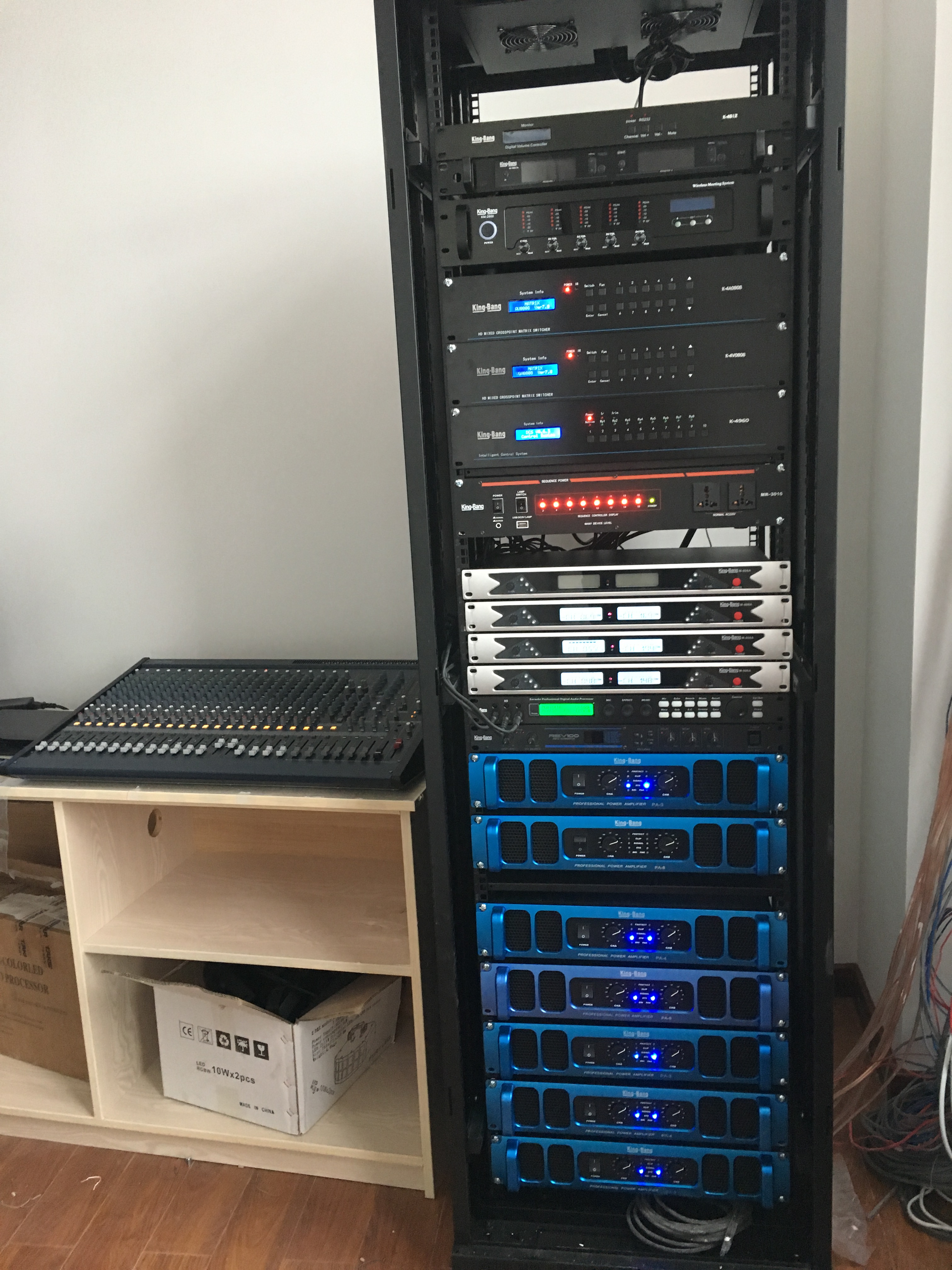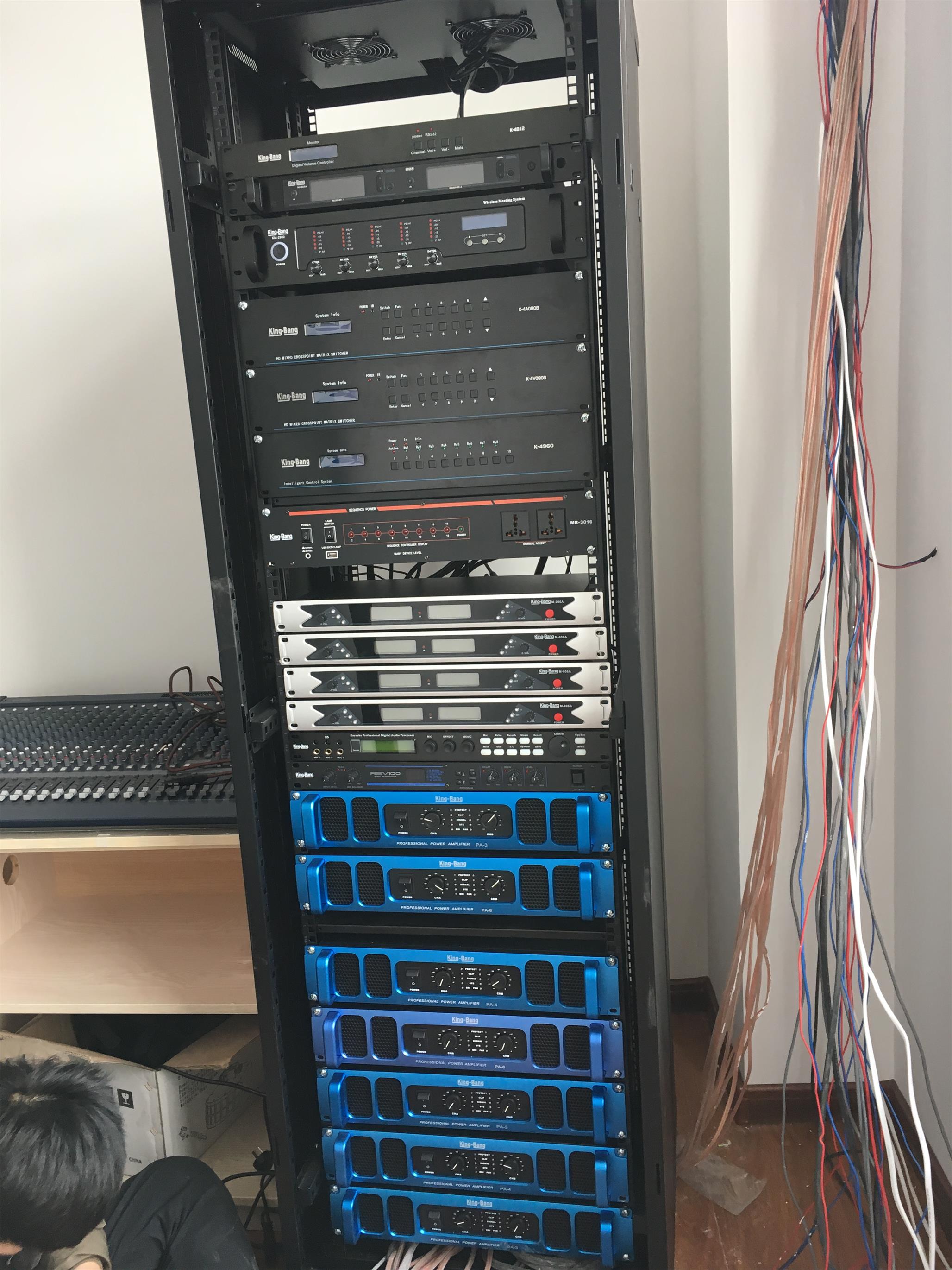 极具代表性的多媒体有源音箱,整套音响系统还包含了带有LCD显示面板的具有专利设计的PA系列功放,24路调音台MX24C,标准型可编程中央控制系统等等其他处理设备、话筒产品,为整个扩声系统提供了稳定有力的保证。所有无源音箱都采用数字功放和可完全编程的DSP音频处理器,保证了多功能厅一流音响效果。