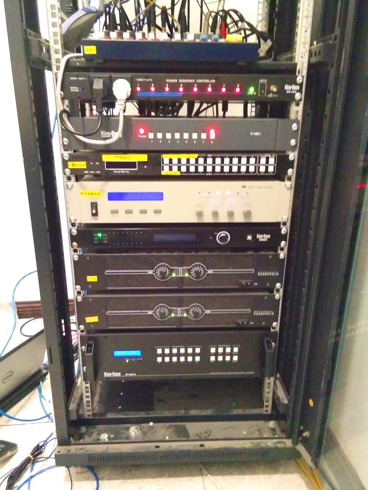 会议系统主要由扬声器、功率放大器、音频处理设备、调音台、话筒、音源等设备组成。整个系统选用同类产品中音色优美的高档次音响器材组成音响系统。