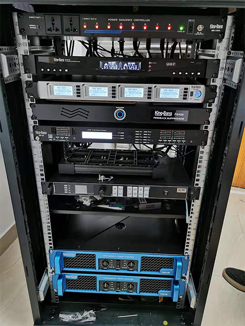 放大设备——指对经过调控设备混音输出、信号处理后的信号进行后级功率放大设备,这里指专业功率放大器;重放设备——指将经过后级功率放大器放大的音频信号进行电—声转换并释放表现出来人耳可懂的声频信号的设备,这里指扬声器;