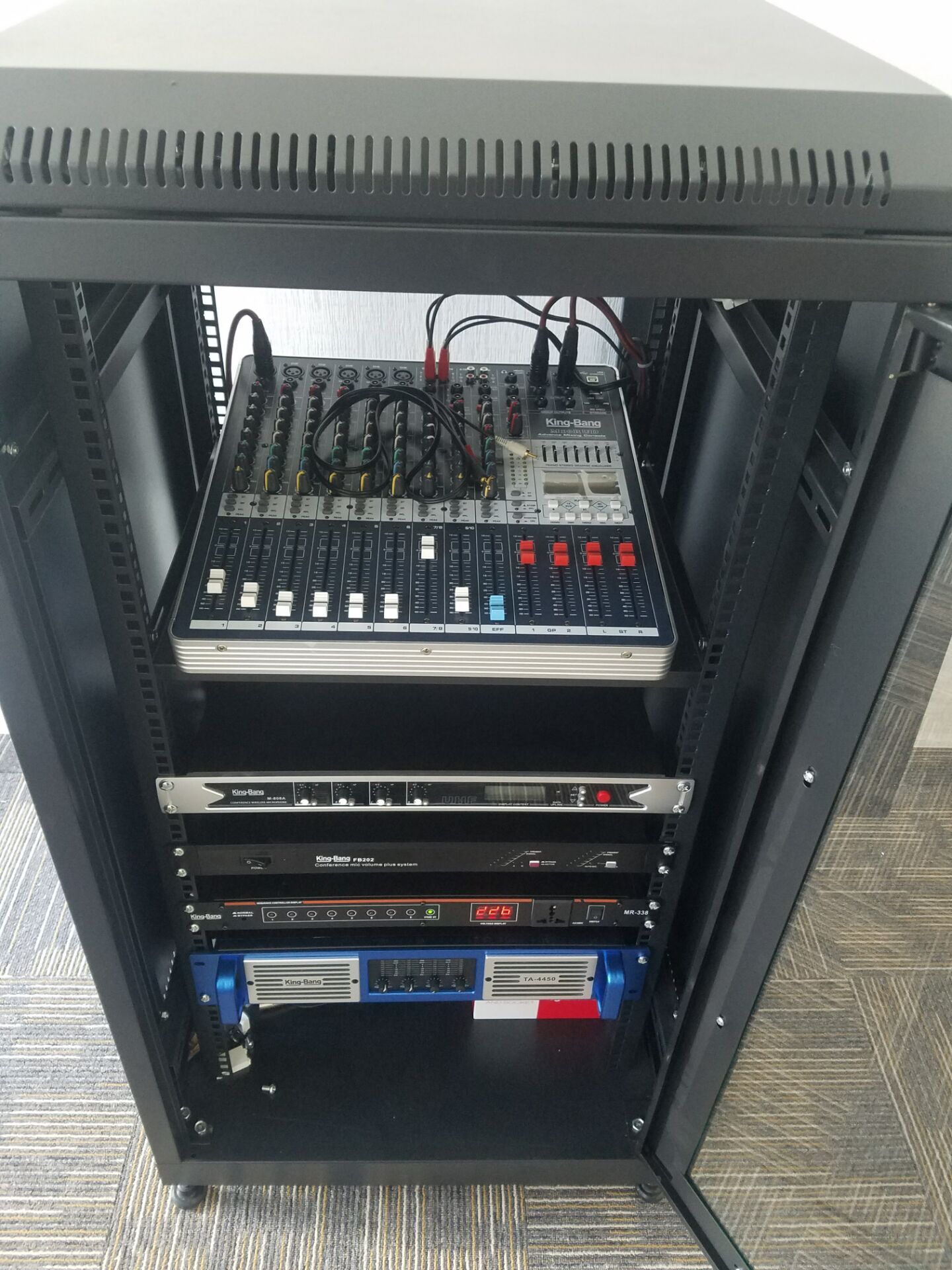 专业扩声系统简单来说就是把声音信号放大,主要由声源、音频处理设备、功放及扬声器系统组成。通过计算会议室的音响场地系数进行设计,保证会议室每个角落的声场听觉均匀,音响效果达到语言清晰、无失真、声场分布均匀。