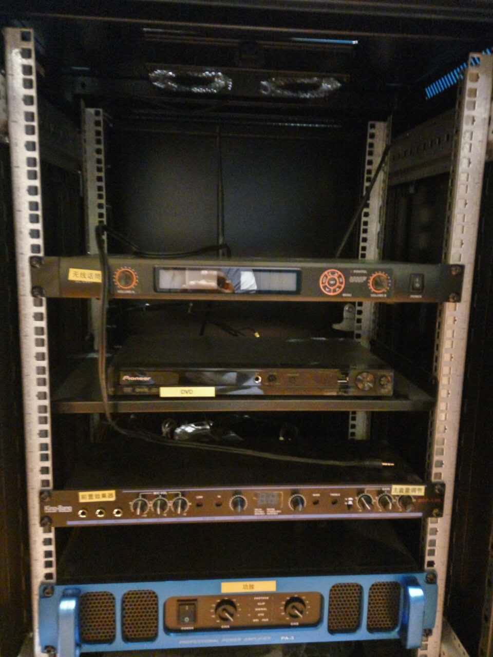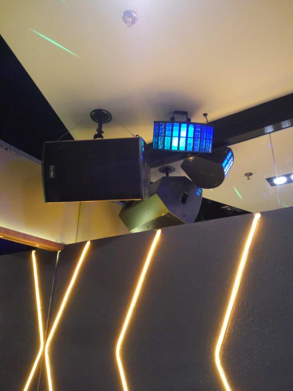 整个系统包括KT-10的两分频单10"卡包箱以及S-166的优质的天花喇叭,所有音箱由两台K-7500合并式功放500W,DSP-100的专业数码HI房卡拉OK前级。整个系统主要用于背景音乐的播放。