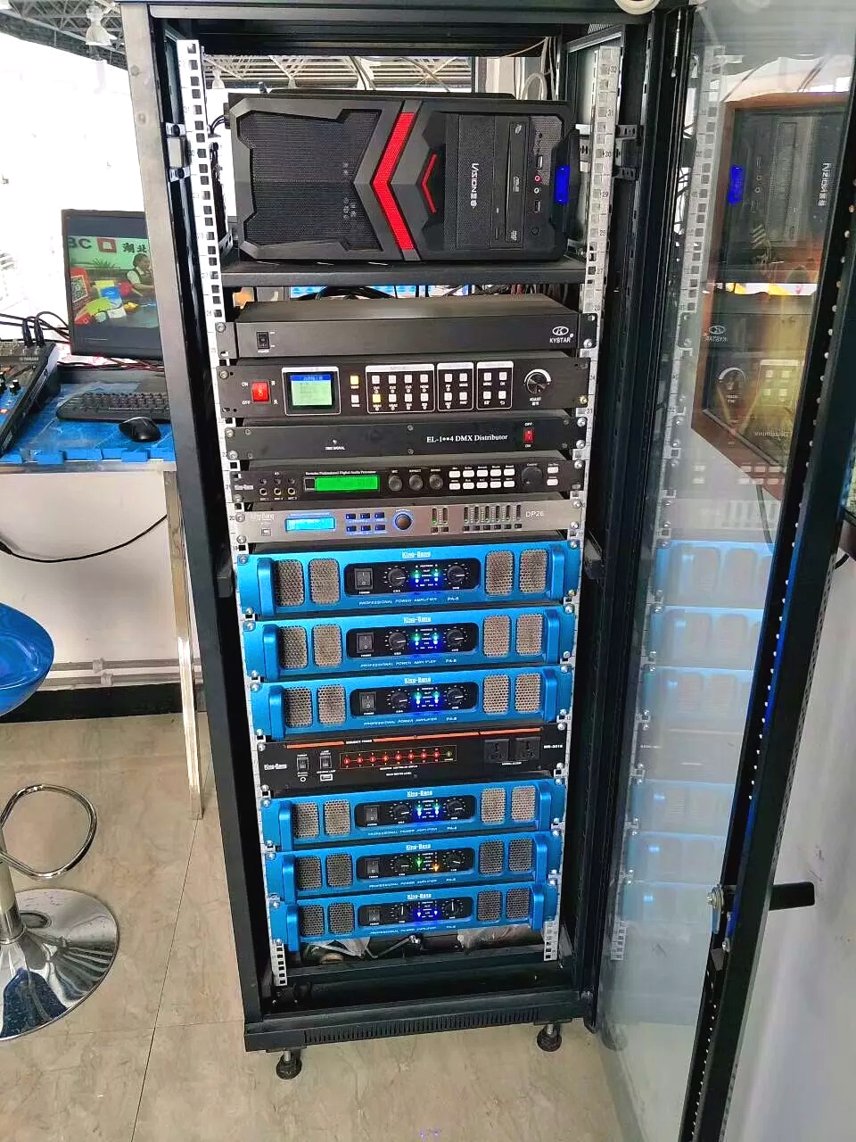此外采用音箱处理器和PA系列功放,不但为音箱提供了精确的功率来源,还能进行智能管理和精确的数字音箱处理控制。