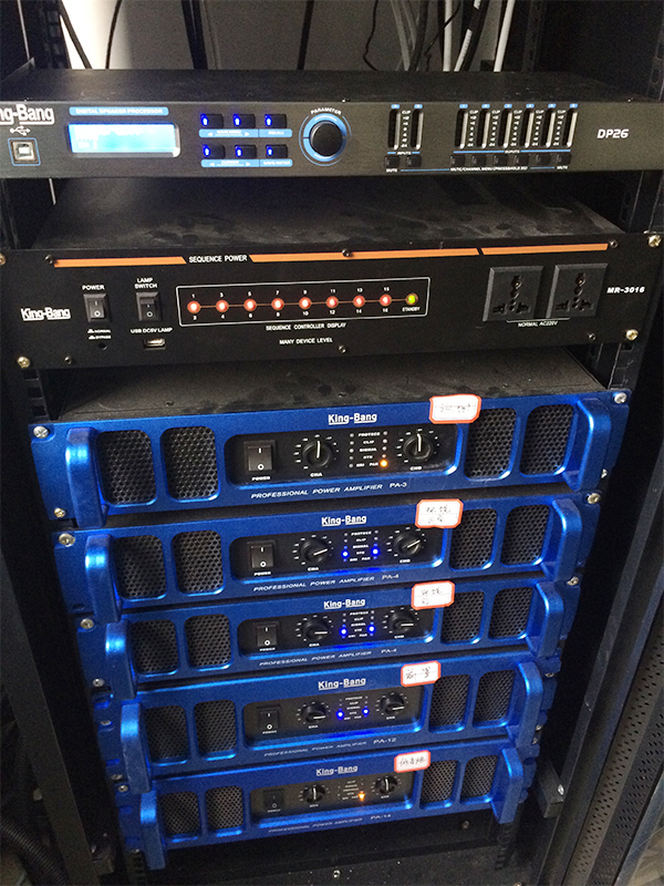放大设备——指对经过调控设备混音输出、信号处理后的信号进行后级功率放大设备,这里指专业功率放大器;重放设备——指将经过后级功率放大器放大的音频信号进行电—声转换并释放表现出来人耳可懂的声频信号的设备,这里指扬声器;